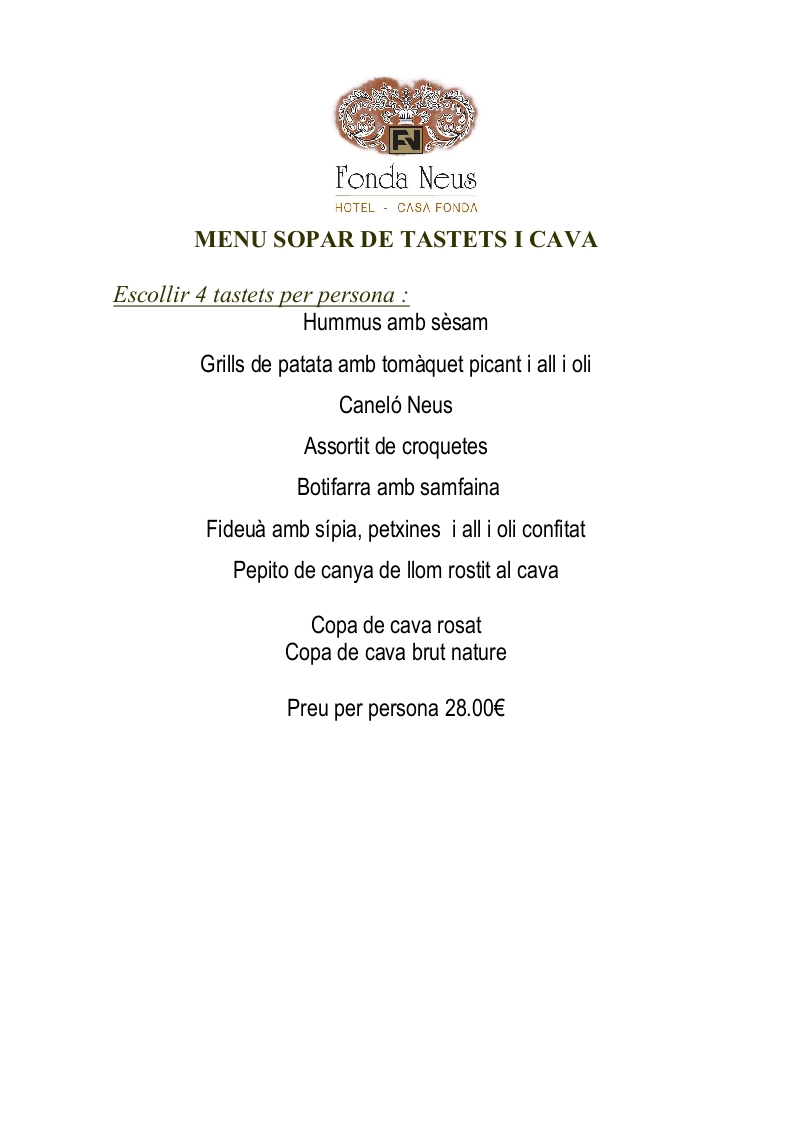 Actualment, l’equip de cuina de la Fonda Neus ofereix una cuina tradicional catalana i un maridatge de plats elaborats amb essència de cava. La benvinguda al saló Verema per presentacions d’empresa o aperitius per uns 120 pax., i el saló per convits Dégorge per més de 250 comensals; servits pels nostres professionals de sala. El nostre nou hotel de deu habitacions amb connexió wifi, disposa de dos salons privats: Saló Montserrat per més de 30 comensals, i el salonet Bon-Matí pel servei de bufet d’esmorzars i com a reservat de grups petits.